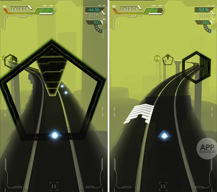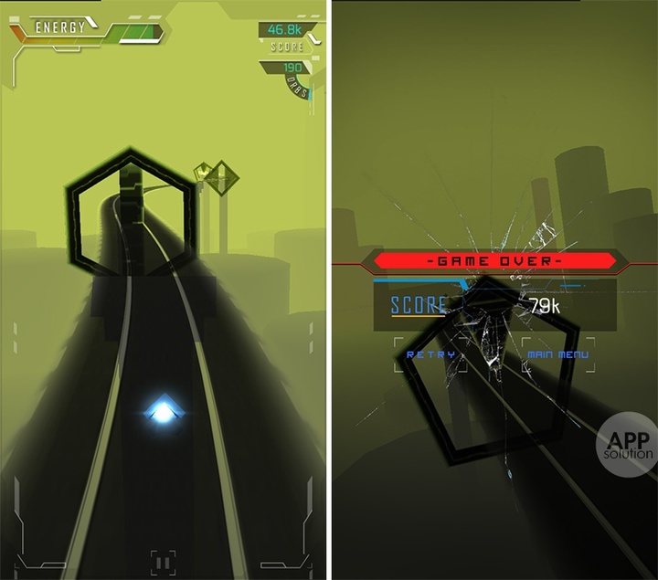 其实,Sonic Surge 的游戏设定非常简单,有点类似于 Temple Run。玩家控制一个光点向前疾驰,在确保不撞到障碍物的同时,尽量的多吃些「光豆」增加分数。但在游戏的过程中,Sonic Surge 的游戏难度却比 Temple Run 高出了不少。