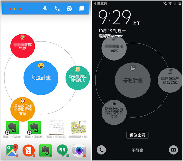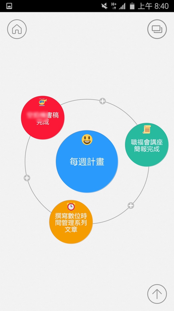 而使用 Mindly 的优点如下图所示,他的格局是一个卫星环绕地球的宇宙,而这样的圆形摆在手机桌面上可以很清楚的读出内容,看起来也好看。