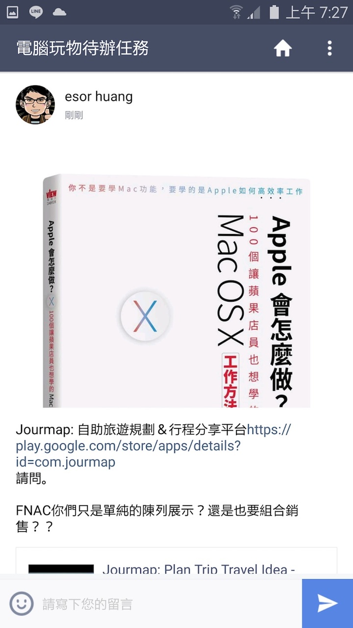 这时候会把这几则讯息、图片合并成一则聊天室成员才能看到的文章,出现在聊天室的布告板中,而因为这是单人群组,所以一样只有我自己可以看到。
