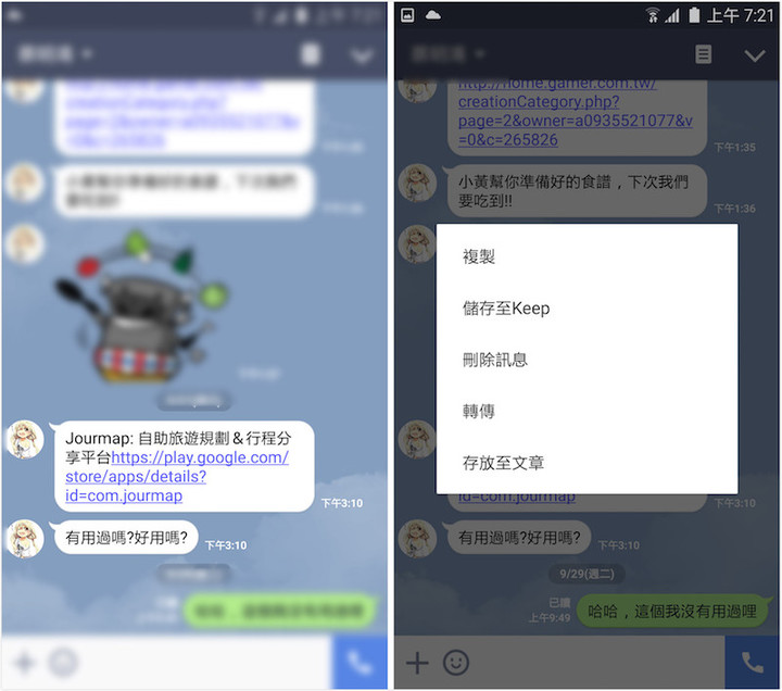 在任何一个 LINE 聊天室中,按住讯息、图片、档案,在弹出的对话框中点击[储存至 Keep]。