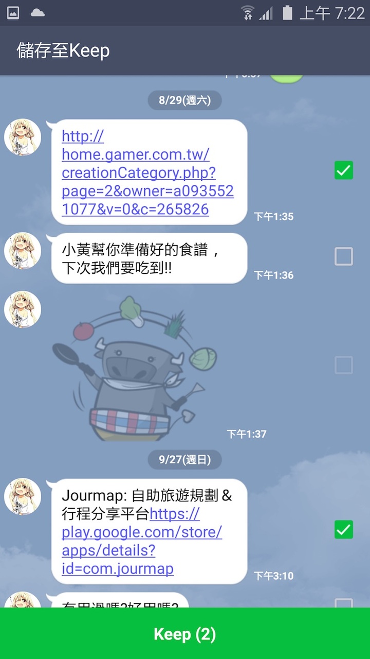这时候会先切换到选择画面,我可以同时选择多则讯息来一次转存,这有利于我们过滤掉不重要的对话,勾选重要的段落一次转存。