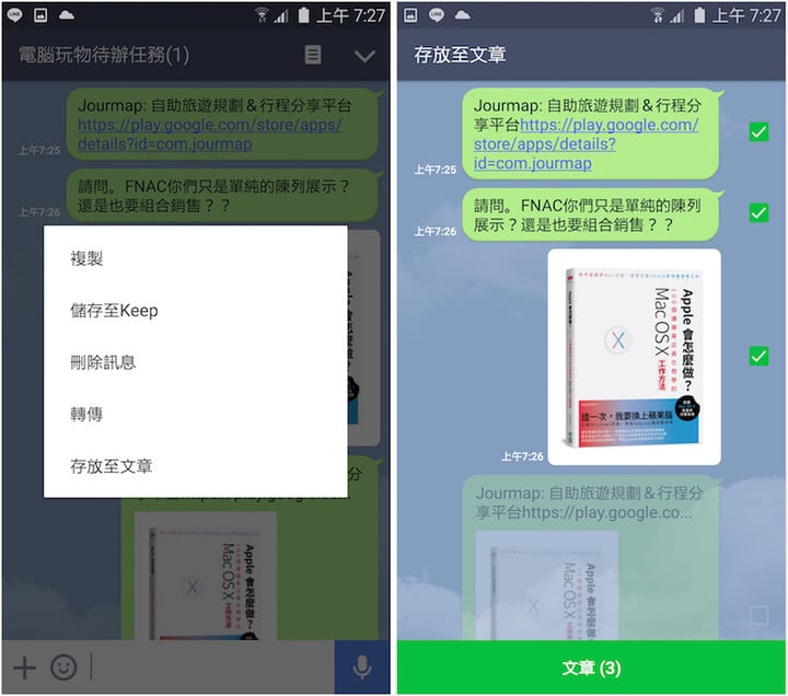 按住讯息,选择[存放至文章],然后勾选不同则内容,按下转贴到文章。