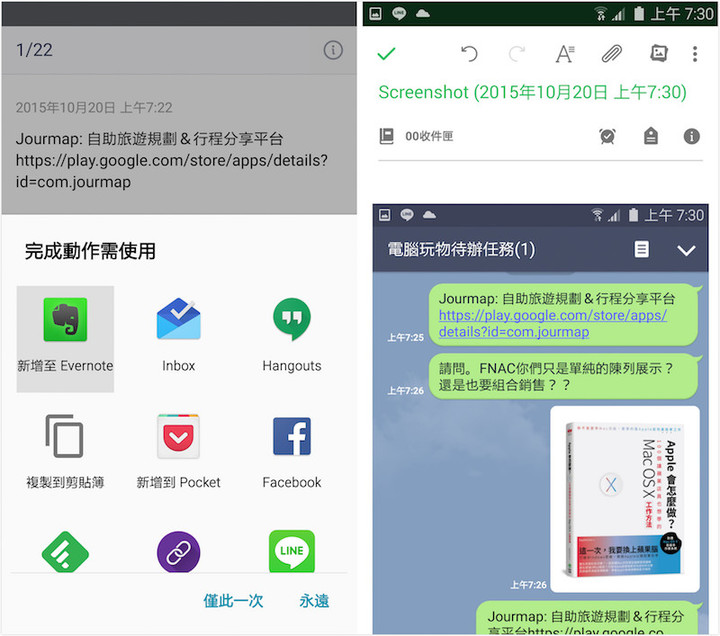 或者还有一个方法是直接截图,把这个画面中的 LINE 讯息截图下来,「有图为证」还能当作事后讨论的证据,然后把截图转存到 Evernote 作任务管理。