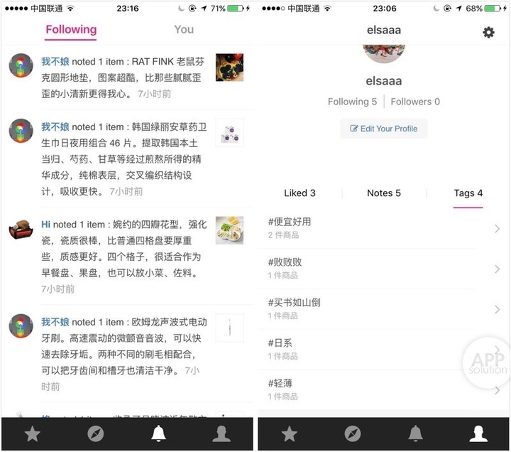 在甄选好物的同时,果库还能带你结识一批购物爱好者,每个商品下面都可以看到他们的赞美或吐槽,亦或是真实的使用体验。你还可以关注一些与自己志同道合的用户,在通知页面中查看他们的动态,看看大家都在买什么,让这些购物达人带着你一起选好物。在个人页面中,你可以方便地查看自己喜欢、评论以及贴过标签的商品,它们将是你在买买买之前最靠谱的参考。