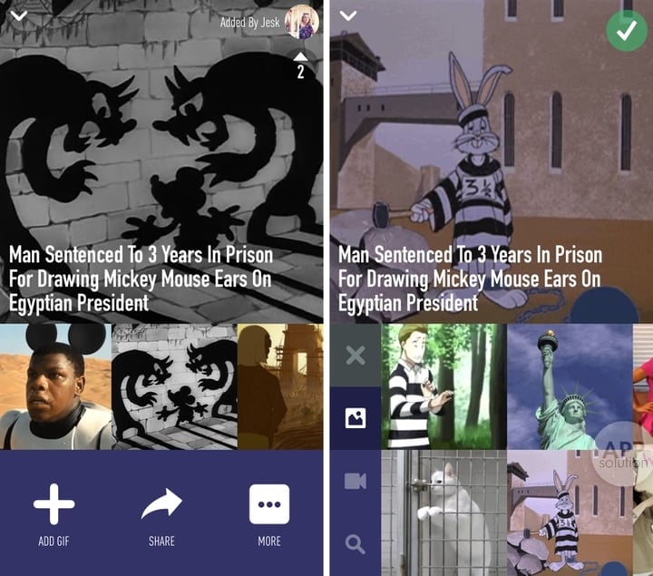 点击新闻,可以看到不同用户针对该新闻添加的 GIF 图,类似于图片评论功能。想添加评论?没问题!NewsGIF 会推送符合标题的图片,还支持关键词查找,当然,你也可以自己录制一个。