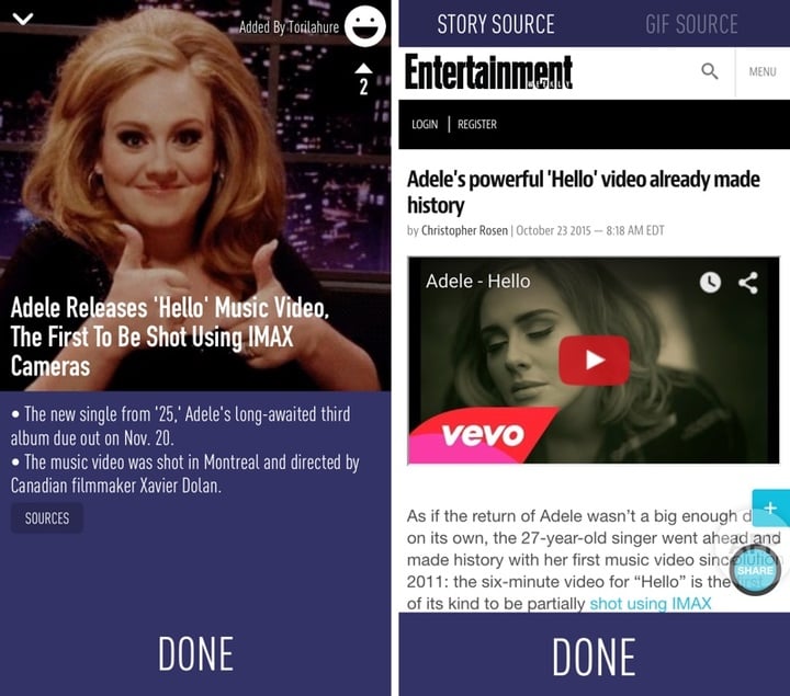 毕竟是新闻类应用,NewsGIF 专注搞笑的同时不忘将报道集成起来。点击「More」可以追踪新闻及 GIF 图片的来源,方便深入阅读。