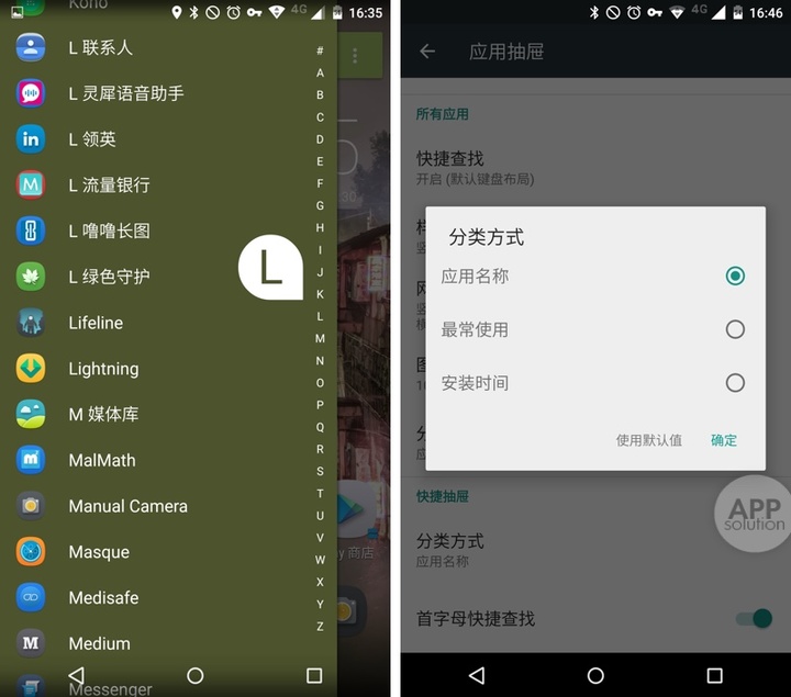 刚开始接触 Action Launcher 的时候,我最惊艳的便是侧边打开的应用列表。这种应用列表的最大优势就是通过滑动侧边的字母表,就能够快速定位所需要的应用。后来我发现,Action Launcher 有许多非常细微的功能,看上去不起眼,但是使用起来却能够大幅度提升效率,所以我一直将 Action Launcher 作为自己的主力 Launcher。