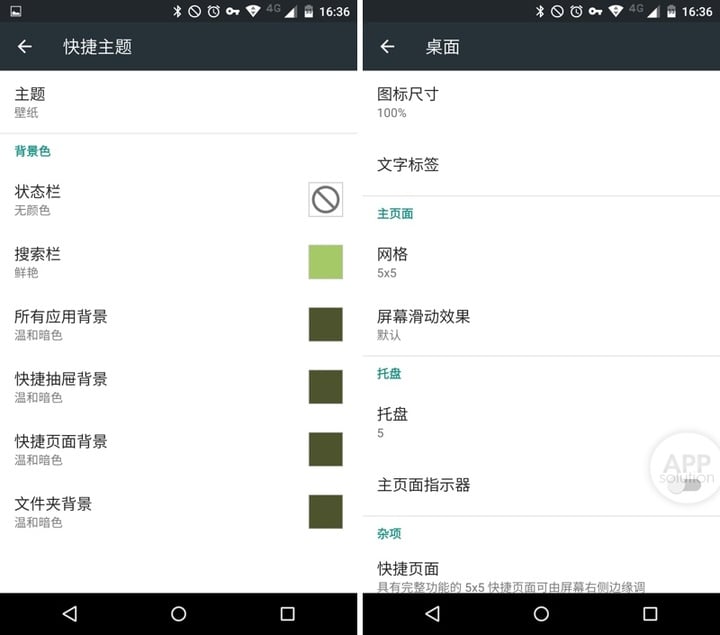 不仅简单,而且它的个性化元素并不那么单一。Action Launcher 3 新增了一个 Quick Theme 功能,通过简单的几个颜色搭配,就能够搭配出清爽简洁的桌面。如果你懒,Action Launcher 也可以自动帮你在你的壁纸中取色(甚至支持一些动态壁纸)。