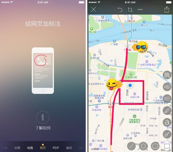 这应该是今天出场的标注工具中最友好的一款了,第一次使用会有贴心的操作指导。此外,它还允许你按需选择标注图片(地图、网页、PDF……)。比如,你若想在地图上标注,它便会调用地图方便你截图,无需主动打开其他地图工具。