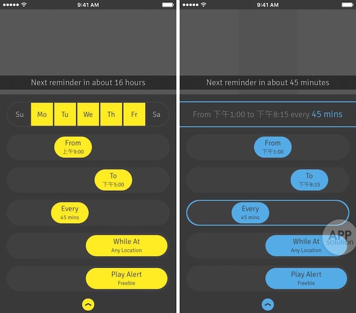 在主界面中,我们可以点击上方按钮来设定提醒日期。通过简单滑动滑块,便可以设置提醒的时间范围以及提醒频率。与大多数同类应用采用滚轮选择时间相比,采用滑块的交互方式对这样的轻量级提醒应用来说显然要便捷高明得多。