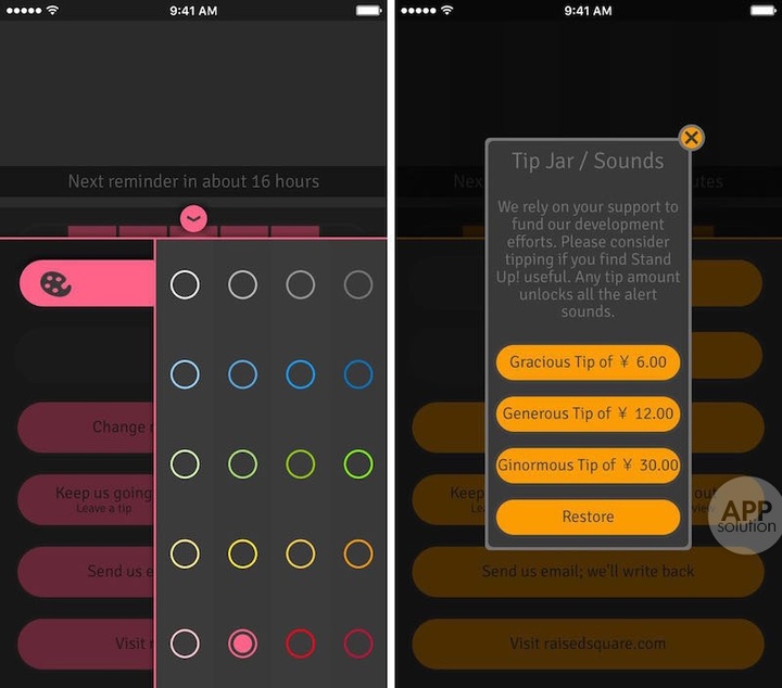 Stand Up!还提供了仅在当前位置提醒的选项,免于我们出门在外还不停收到通知的麻烦。如果你认为目前的提醒铃声太过单一,你也可以以 6 元内购的方式解锁另外多达 24 种的铃声,足够你慢慢挑选。
