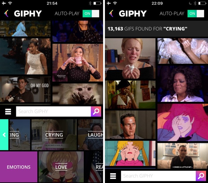 经常会听到有人抱怨说「表情用到方恨少」。真的,聊天时能发一个拍案叫绝的动图,简直是聊天地位的象征……幸亏我有 Giphy 在手:打开 app 后,五花八门的 GIF 一下子全都动起来了,移动网络下还可关闭「AUTO-PLAY」,停止自动播放以节省流量。