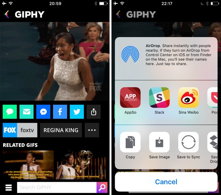 地球最大动图搜索引擎 Giphy 近日华丽升级其 iOS 客户端,去除了原先只能分享到 Facebook Messanger 的限制。现在,你终于可以在 Giphy 中搜索并保存或分享动图了。