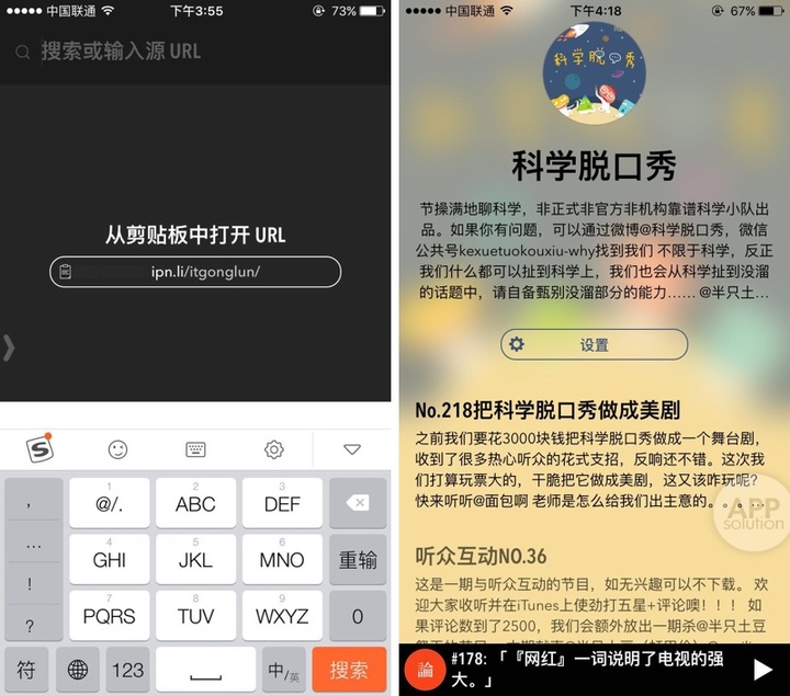 当我进入添加界面的时候,第一个惊喜就这样不经意地出现——Castro 将我存放于剪贴板的播客订阅地址自动读取,让我直接点击订阅。过了一会儿,我发现整个应用没有返回键,但是屏幕左侧有一个让人感到非常熟悉的小箭头,暗示你可以从左侧拖动返回。