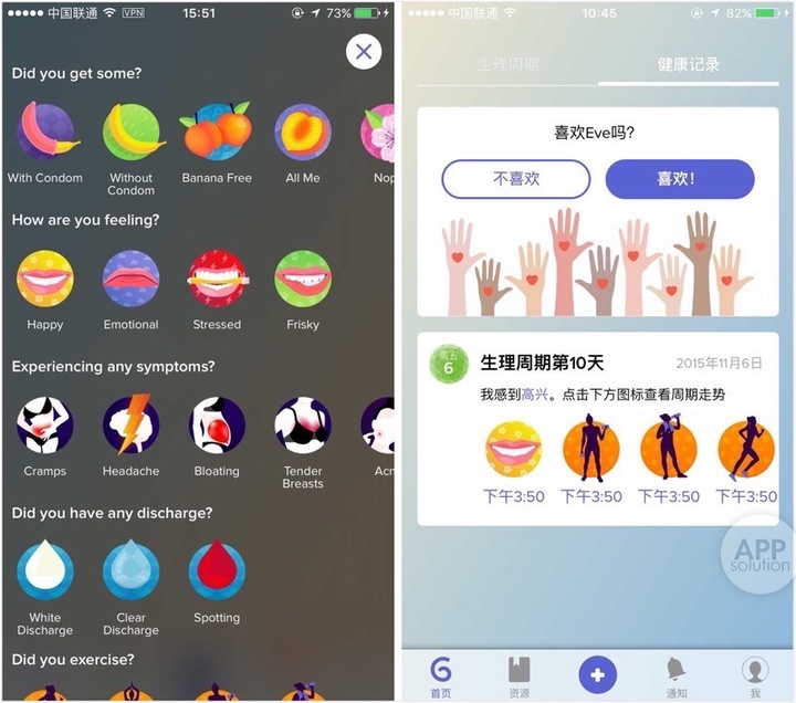 Eve 中心紫色的加号可以添加健康记录,今天感受如何?有什么症状?直接选择图片的方式让你更容易坚持每天记录,你还可以在首屏的「健康记录中」 查看每种状态的周期走势,如果坚持记录,可以看到自己在大姨妈期间的状态变化。