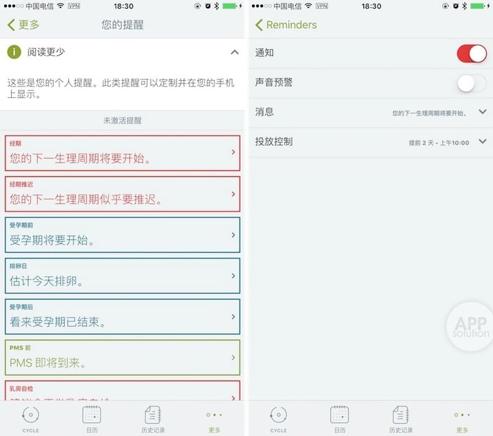 每一个完成的经期周期,都会记录在「历史记录」中方便查看。「更多」中的「提醒」可以设置提醒,提醒事项包括姨妈期前后、排卵期前后、PMS、BBT(基础体温测量)等多种与姨妈相关的事件,你还可以设置提醒时间和提醒周期。满足了更多用户的需求。