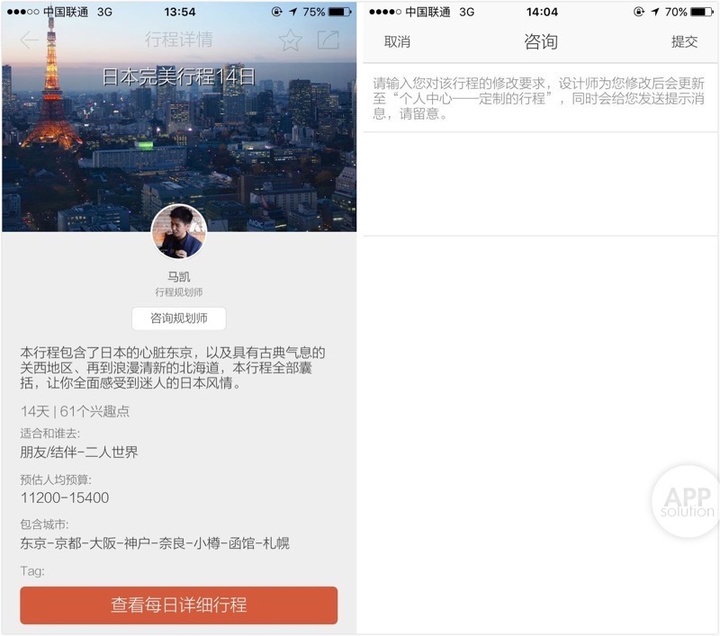游谱中最有特色的是行程规划师的角色,Ta 会按照你的旅行设置制定最适合你的行程,再也不用在茫茫的游记大海中找兴趣点了。在行程详情的首页,你可以查看本次行程的简单介绍,人均价格和游玩城市一目了然。你还可以在这里咨询行程规划师,他会根据你对行程的修改需求帮助你修改,一个更加满足用户个性化需求的行程会在三个工作日内更新到你的个人主页中。