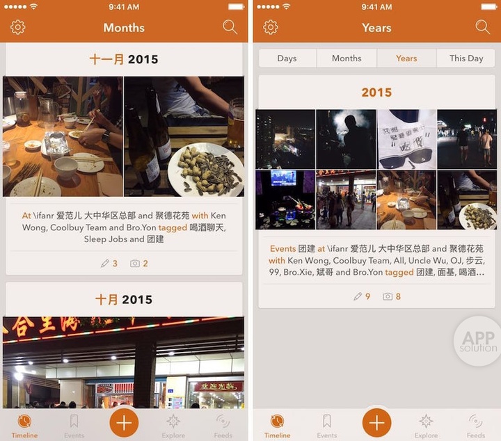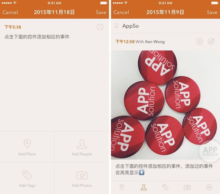 我们都知道日记的几大要素:时间、地点、人物、事件,Momento 完美把握了这些要素。时间设定、地理位置标注、与谁为伴、关键词标签等统统都有,并通过图片添加延展了整个事件的信息量,结合简练的文字说明,信息量不会比传统日记少,更不会有传统日记「说废话」的可能。