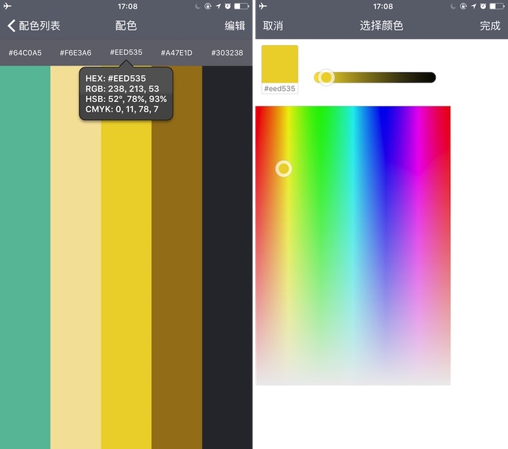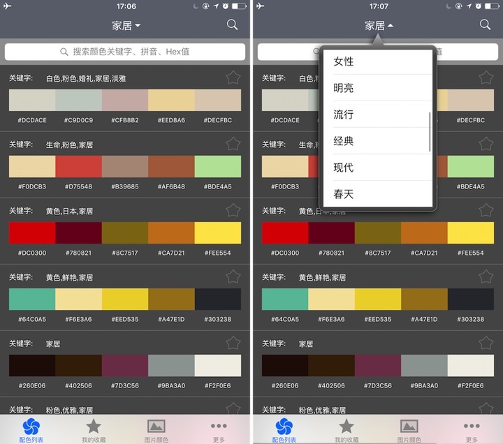 如果遇到了自己喜欢的颜色,你可以点亮颜色条目右上角的星号,将这条颜色添加到收藏当中,免费版的用户最多可以收藏三种配色。