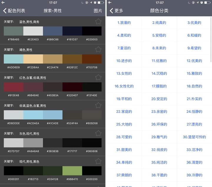 当然,你还可以通过搜索关键词来寻找想要的颜色,所有的关键词都罗列在「更多」中的「颜色分类」中,160 个总有一个能够激发你的灵感。