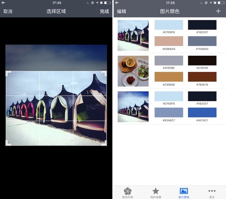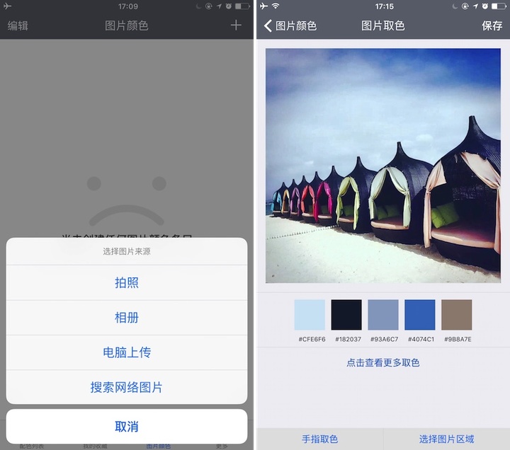 想将某个图片的颜色识别为配色模板?Color Book 的这个功能做得非常细致,你可以选取相册、电脑和网络中的任何图片,或者是拍照识别。