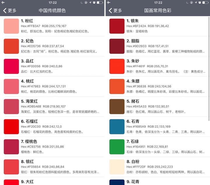 在「更多」中,用户可以继续发掘更多美丽的颜色。应用中提供了两组超美的颜色合集——中国传统颜色和中国画颜色,这两个 list 就可以让 Color Book 在手机中获得永久居住权了。