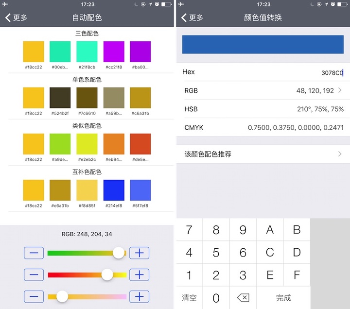 Color Book 中还贴心地设置了自动配色器和颜色换算器。自动配色器中提供了四种方案——三色法,单色法,相似色法和互补色法,以后做 PPT 再也不用担心选什么颜色好了,只要指定一个基础色,四种配色方案信手捏来。而颜色换算器更是小而实用的功能,一共有四种颜色表达法的数值,确定了一个数值就可以看到其他三种颜色的换算值。