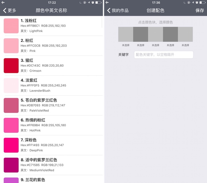 Color Book 中的所有颜色都包含在「颜色表大全」中供用户检索,你还可以在「更多」中查看这些颜色的中英互译,与境外设计师交流时再也不用头疼啦。此外,「我的配色作品」中可以创造自定义配色,同样的,免费版用户只能保存三个模板。