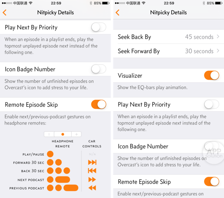 设置中的「Nitpicky Details」选项图示说明了在此应用中中键的使用方法,如快速按两下不是切换为下一首而是快进 30 秒,快速按三下且第三下不松开不是快退而是切换到上一首,等等。你还可以通过设置改变单次快进/快退的时长。对于播客爱好者们,应该也是个不错的功能。