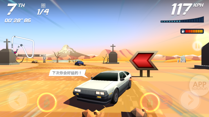 不久前,Horizon Chase 在 App Store 上架了中文版本。虽然内容没有机翻痕迹,但个人感觉,游戏里的嘲讽台词,有股「央视翻译腔」的味道。游戏的 Android 版本也千呼万唤始出来,玩家可在 Google Play 上免费下载,内购解锁完整版本。