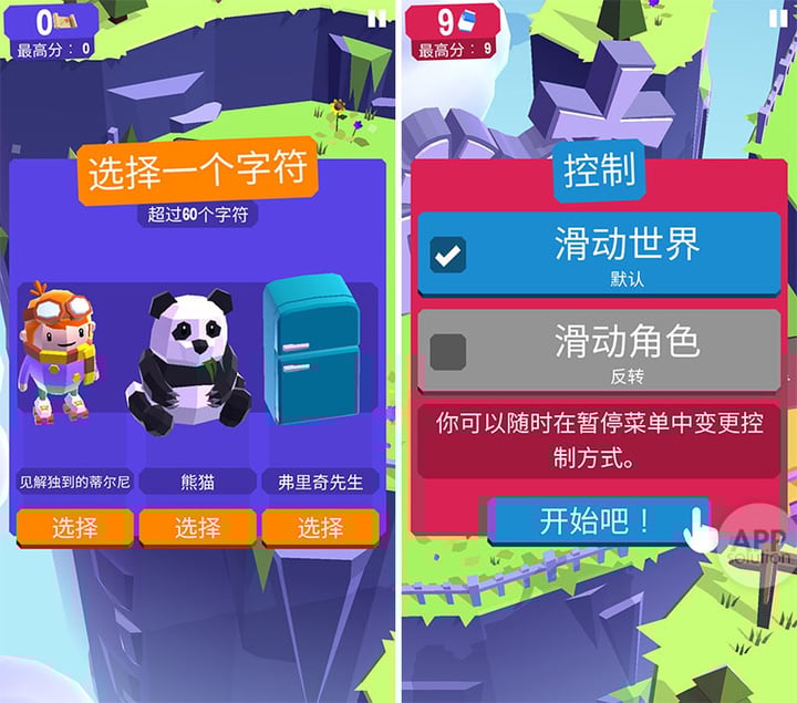 刚进入游戏时,可以选择操控模式,即是要「滑动世界」还是要「滑动角色」。滑动角色会更符合操控习惯,但是这就会让这款游戏失去了一些特色。所以建议还是选择「滑动世界」。