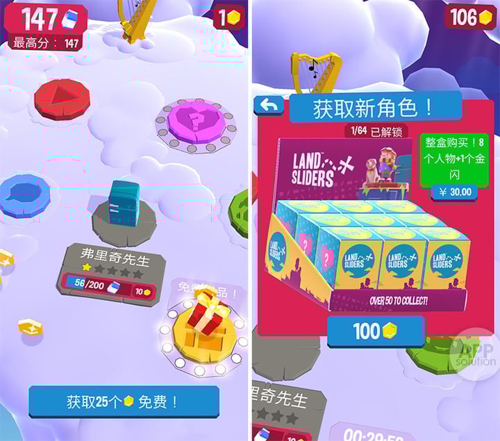 Land Sliders 拥有大量的角色,初始的话有三个角色可以让你选择,更多的角色则需要用金币去购买或者直接内购,通过日常的游戏中很容易获取金币,或者是观看一个 15 秒到 30 秒不等的广告即可获取 25 个金币。