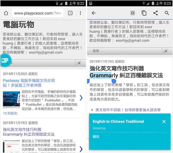 这是一个我觉得在手机上很有用的翻译功能,事实上,这个功能将会在 Android 6.0 内建!到时候只要圈选在 App 内的英文单字,就能弹出 Google 翻译卡片,不需要切换 App 。
