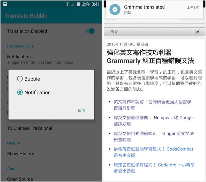 而且 Translate Bubble 不只有翻译气泡模式,如果你不喜欢气泡,可以到设定中切换为通知卡片模式。