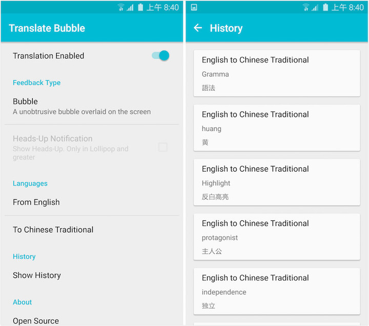- 优点:复制就能即时翻译、最轻巧省资源、气泡或卡片模式可切换、可翻译整段话、开源免费、不需要任何权限、不需要注册帐号、平常不用时可隐藏、支援多国语言、有翻译记录