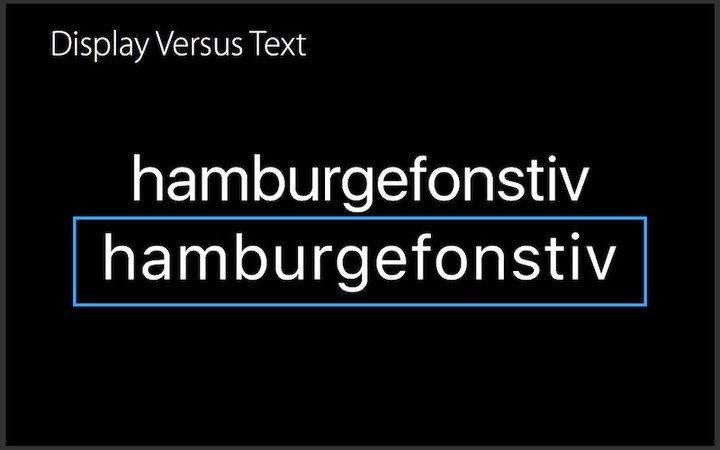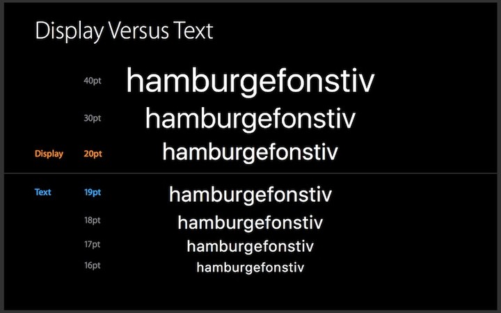 而苹果建议使用规则是:小于 19 pt 使用 Text,大于 19 pt 使用 Display,当你在 APP 里面使用了 SF 字体后系统会自动选择使用 SF-UI-Display 还是 SF-UI-Text。