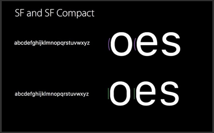 这个比较特别的是 SF 字体包含了两个,分别为:SF-UI-Display 和 SF-UI-Text,他们的差异主要是字体间距的不同,Text 的字体间距较大,再小的字体中更加易读。