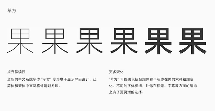 终于,iOS 9 带来了全新的「苹方」,字形更加「优美」,且在屏幕的显示也更加清晰易读,拥有 6 个字重,满足了日常的设计和阅读需求。