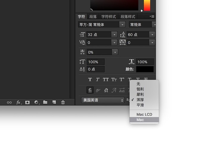 1. PS 中选择苹方字体,渲染方式选择「Mac」