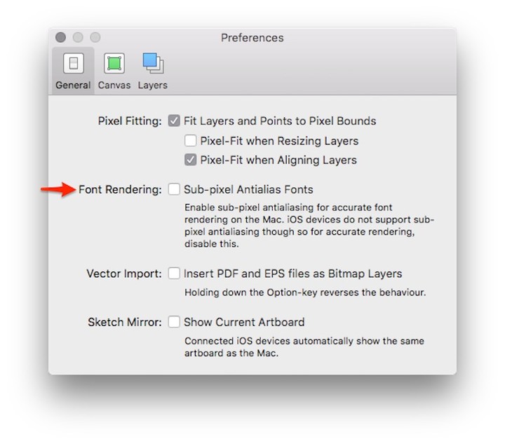 2. Sketch 因为使用的是 Mac 默认的渲染方式,所以不需要选择,但是对与中文却有问题,如下图(上),解决方案就是:打开 Perferences → General 去掉 Font Rendering 的勾选就正常了。