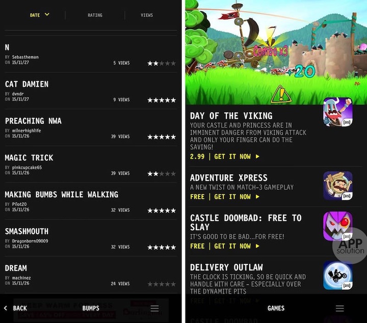 「九宫格」正中间的 BUMPS 则是 [adult swim] 特有的社交功能,带有浓烈的美式街头文化气息。人们在这里发布只言片语,可以是吐槽,也可以是随便什么,哪怕是个「Yo」。作为反馈激励,[adult swim] 提供发布信息的浏览次数和评级。
