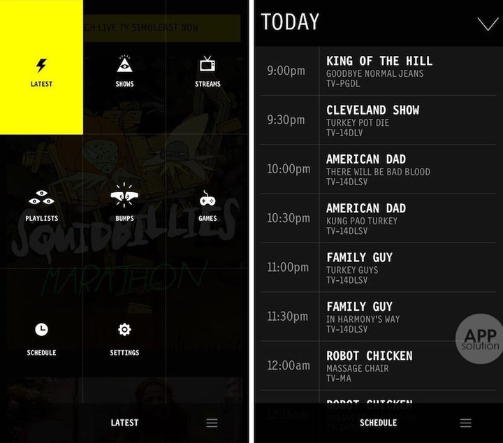 看完内容,我们再来看功能。「九宫格」的功能菜单被证明是一种学习成本很低的引导方法,能查到节目排期表也充分体现了 [adult swim] 的传统媒体流程和直播属性。
