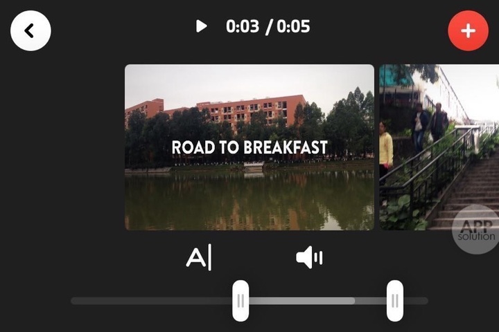 修剪视频时,我们可以调整视频的起始与结束时间,通过长按某段视频后拖动将其删除、复制或者移动它的相对位置。除此之外,中间的两个按钮还可以让我们为这段视频添加文字以及调节它的音量大小。