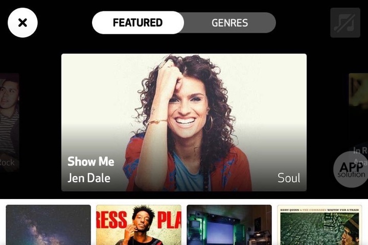 封面墙的设计不仅使呈现的所有曲目一目了然,也让挑选音乐的过程变成了一种视觉享受。点击专辑封面后即可试听,试听时点击底部的 i,艺人的基本资料就会展开在我们眼前。选中后经过数秒的等待,音乐便可从云端浸染到你的整段视频之上。