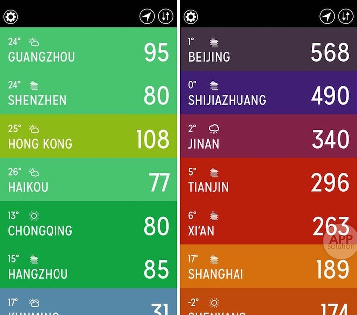 Airpocalypse 根据空气污染程度等因素做了配色,并内置了两个排序逻辑 —— 离使用者地理位置的远近和南北纬度高低。点击右上角的两个 icon 可以分别在这两个逻辑下进行升降序排列。