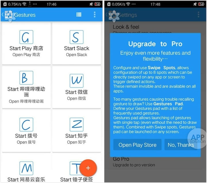 承袭 Material Design 风格的它有着简洁美观的界面。添加一个应用启动手势只需要 4 步,而且前 3 步是要重复划 3 遍你想要定义的手势,之后再将手势与想要启动的应用关联即可。需要注意的是,自定义的手势只支持一笔画就。
