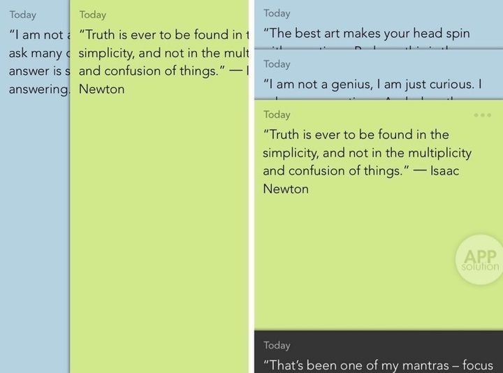 添加多条便签后,我们既可以左右滑动来浏览相邻的便签,也可以双指捏合至应用主界面,所有便签便已重叠卡片的姿态展现在我们面前。