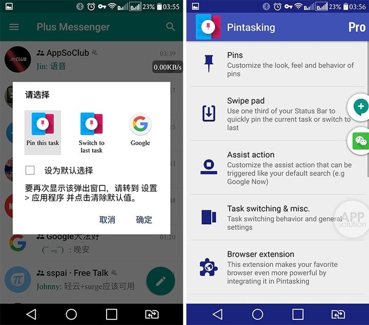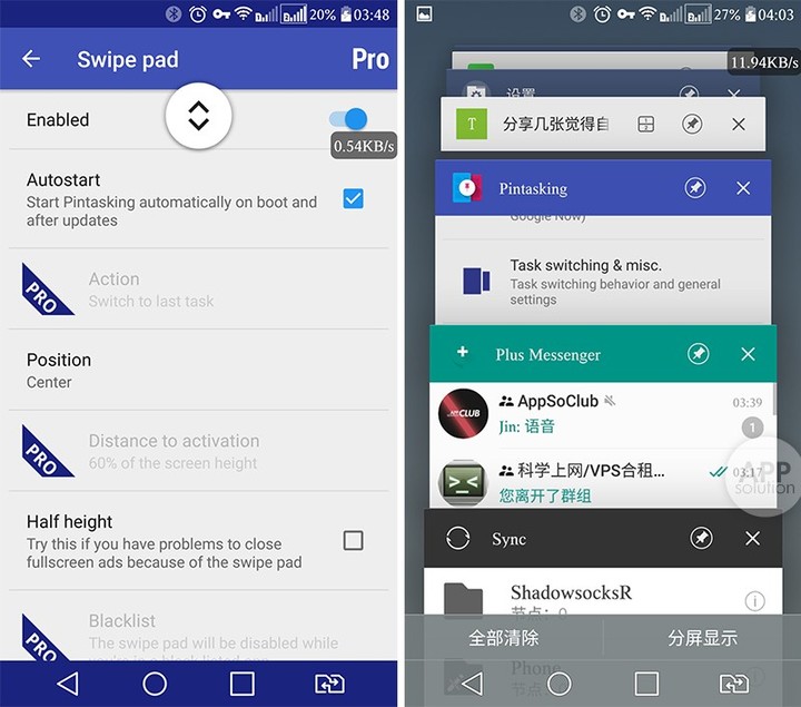 在 Pintasking 的设置里面还可以启用一项「Swipe Pad」功能。Swipe Pad 其实是一种手势控制,在特定区域下滑就会触发效果,切换到上一个应用。省去了以前切换应用需要划出 Pie Control 然后选择任务再点击想要切换的任务的繁琐,Pintasking 只需要手指轻轻一划即可。