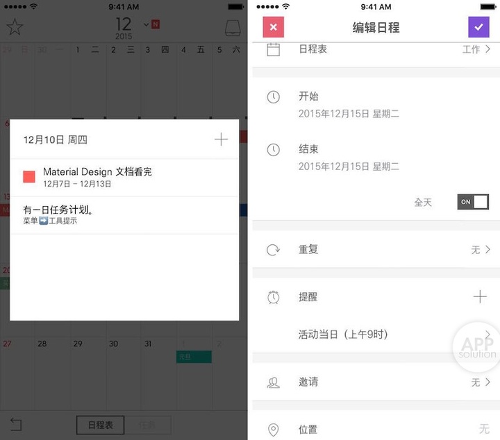 通过点选某一项日程安排,你可以对它进行更加具体的编辑,比如添加位置和具体的时间区间。此外,JUNE 还设计了长按和滑动的手势操作,让交互变得丰富。