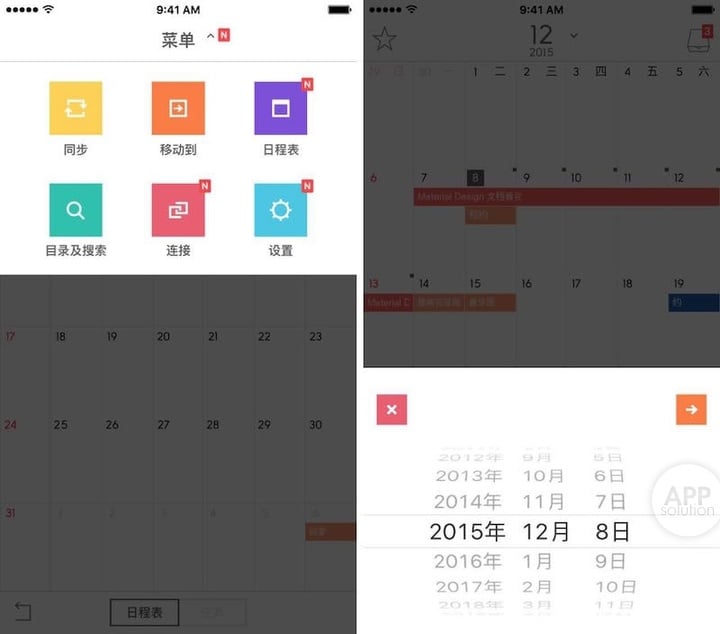 点选正上方年月 Title 可以拉出菜单,菜单的设计中规中矩,显然还带有一种黄页的风格。同步功能是针对已关联其他 Canlendar 工具而言的,移动则能够让你快速翻到想要的日期时间。